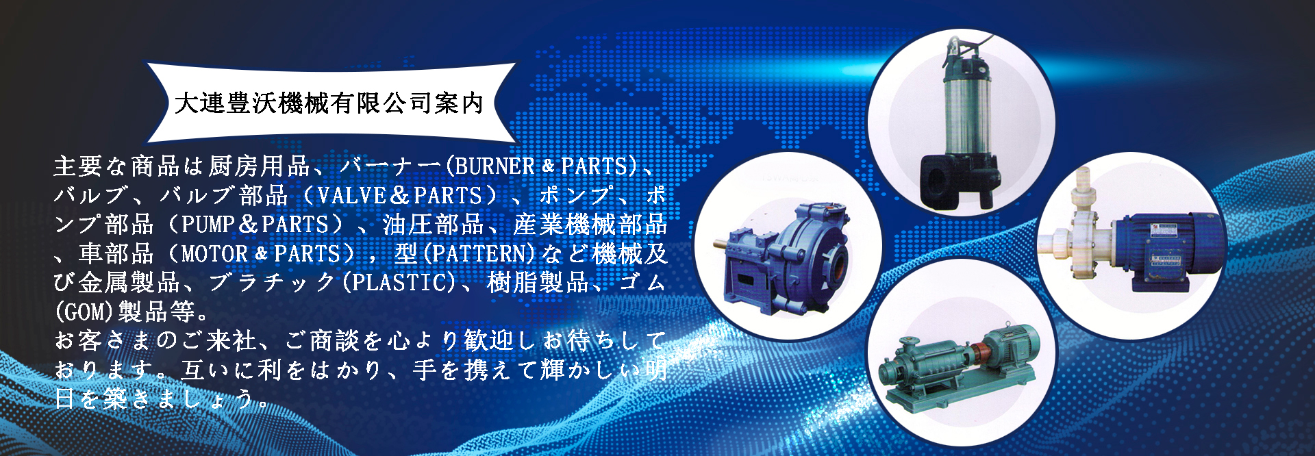大連豊沃機(jī)械有限公司は國(guó)際貿(mào)易を主にして 専門商社でおり、子會(huì)社の機(jī)械加工工場(chǎng)を1社持ち、業(yè)務(wù)提攜パトーナが數(shù)社あります。國(guó)際貿(mào)易を従事して十年以上、メインは日本向けですが、アメリカ、ューロパ市場(chǎng)向けも少しあります。砂鋳造(CASTING)(FC,FCD,FACD,ADI)、ロストワックス(LOST-WAX)、鋳鋼(SC,SCS)、ステンレス(SUS)、ダイカスト(DIE-CASTING)(アルミ、真鍮)、鍛造(FORGING)、プレス(PRESS)、製缶(WELDING)など幅多く分野ております。主要な商品は廚房用品、バーナー(BURNER﹠PARTS)、バルブ、バルブ部品(VALVE&PARTS)、ポンプ、ポンプ部品(PUMP&PARTS)、油圧部品、産業(yè)機(jī)械部品、車部品(MOTOR﹠PARTS),型(PATTERN)など機(jī)械及び金屬製品、ブラチック(PLASTIC)、樹(shù)脂製品、ゴム(GOM)製品等。